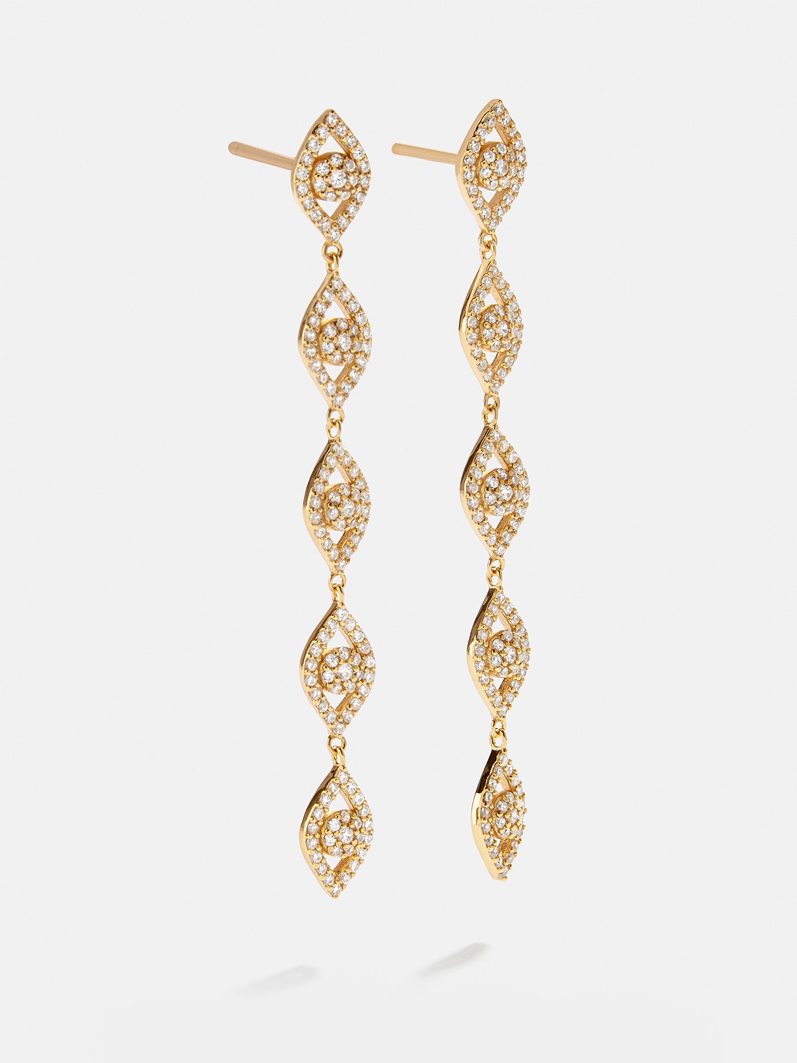 Ward off bad vibes with the 18K Gold Evil Eye Drop Earrings. Meaningful evil eyes repeat all the way down each earring. gracefully swaying as you walk. The best part? These earrings are crafted with 18K Gold and shimmering cubic zirconia ?? so they’ll last years of styling.