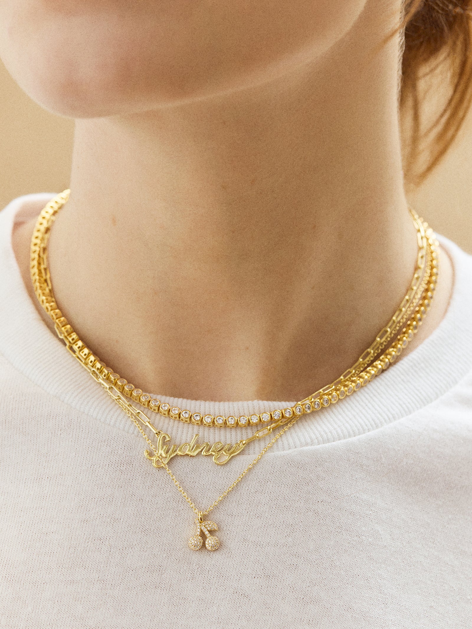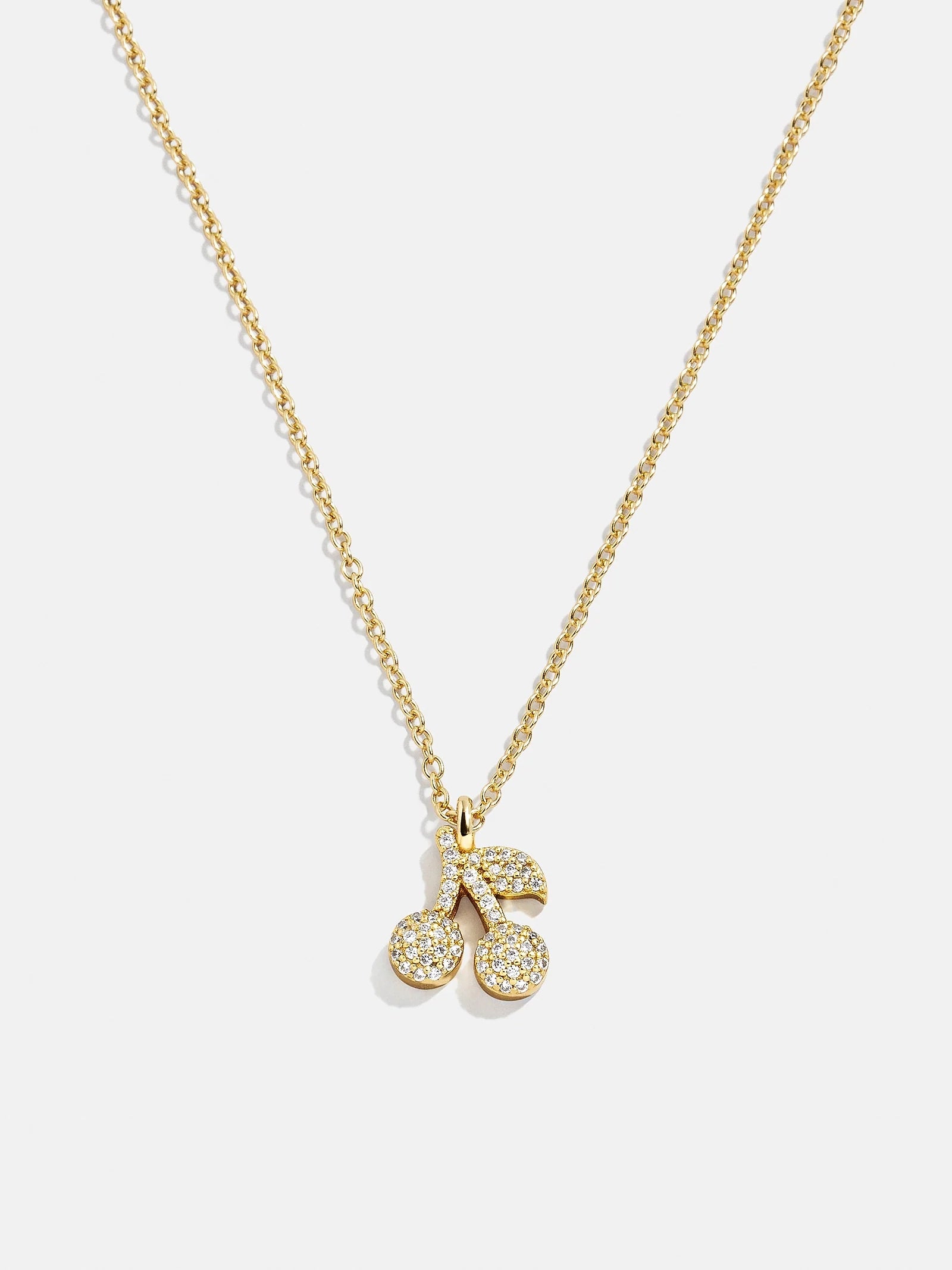 Dress up your necklace layers with cherries ?? the latest cool-girl obsession. The 18K Gold Motif Necklace features a dainty cherry covered in shimmering pav?? stones. Crafted out of 18K Gold and cubic zirconia stones. this necklace will last for years of elegant yet playful styling.