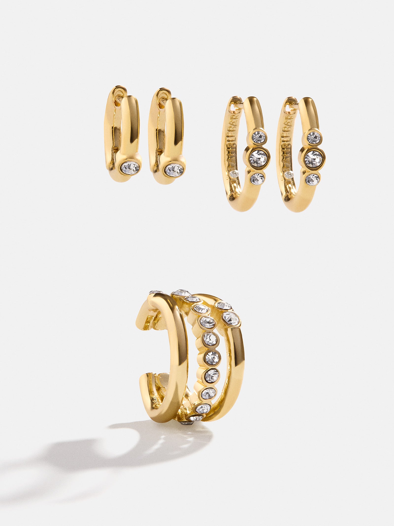 Build an instant ear stack with the Blythe Earring Set. Available with either shimmering glass stones or a classic gold finish. this set is complete with two dainty Huggies and one ear cuff (no piercing required). Wear them all together or mix and match to suit your vibe.