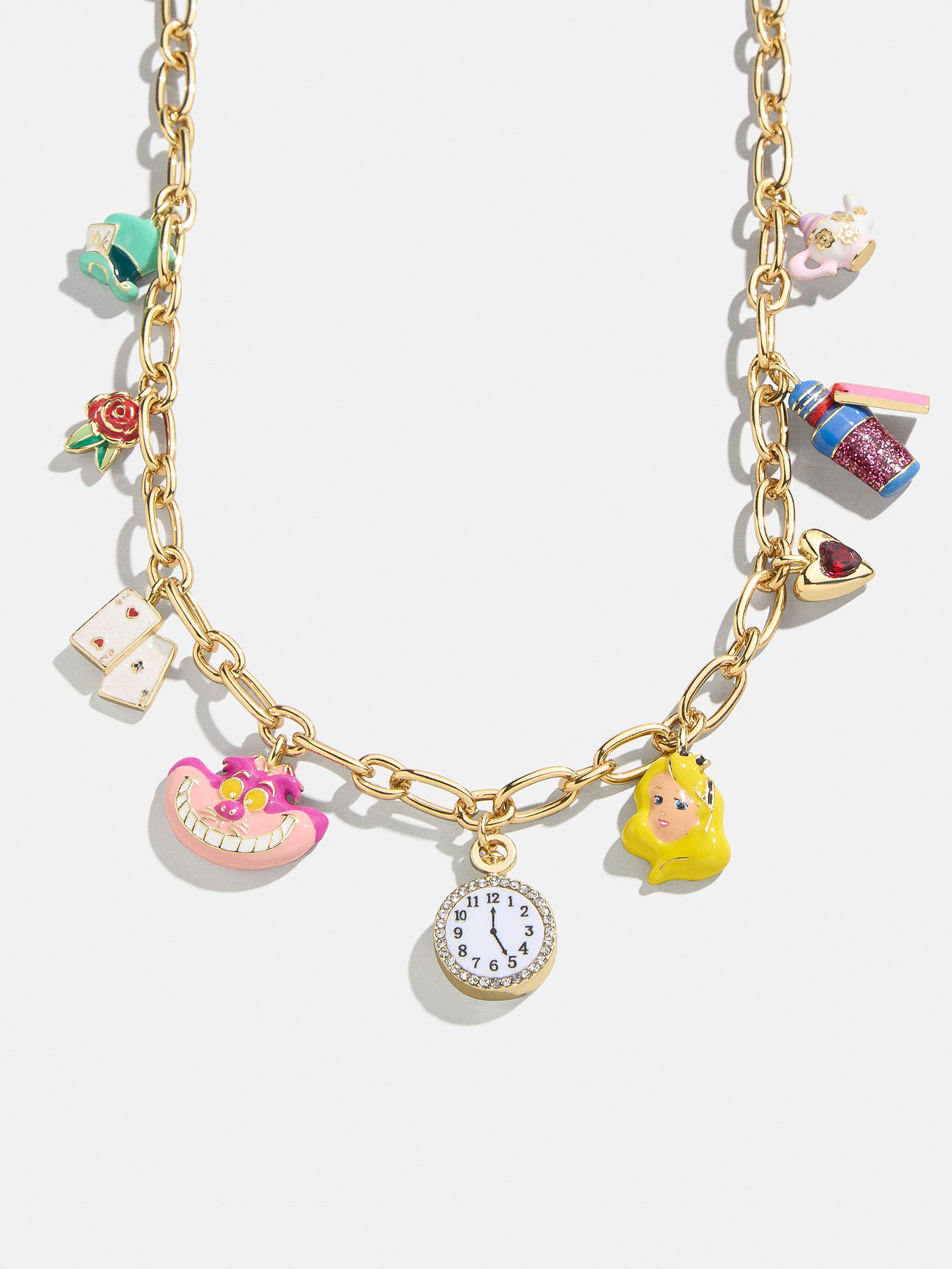 Why be ordinary when you can be madly stylish? The Disney Alice In Wonderland Charm Necklace features a tea party of curious and curioser charms ?? including the Mad Hatter’s hat. a red rose. two cards. Cheshire Cat. a ticking close. a gold heart. a potion bottle. a tea kettle. and Alice herself.