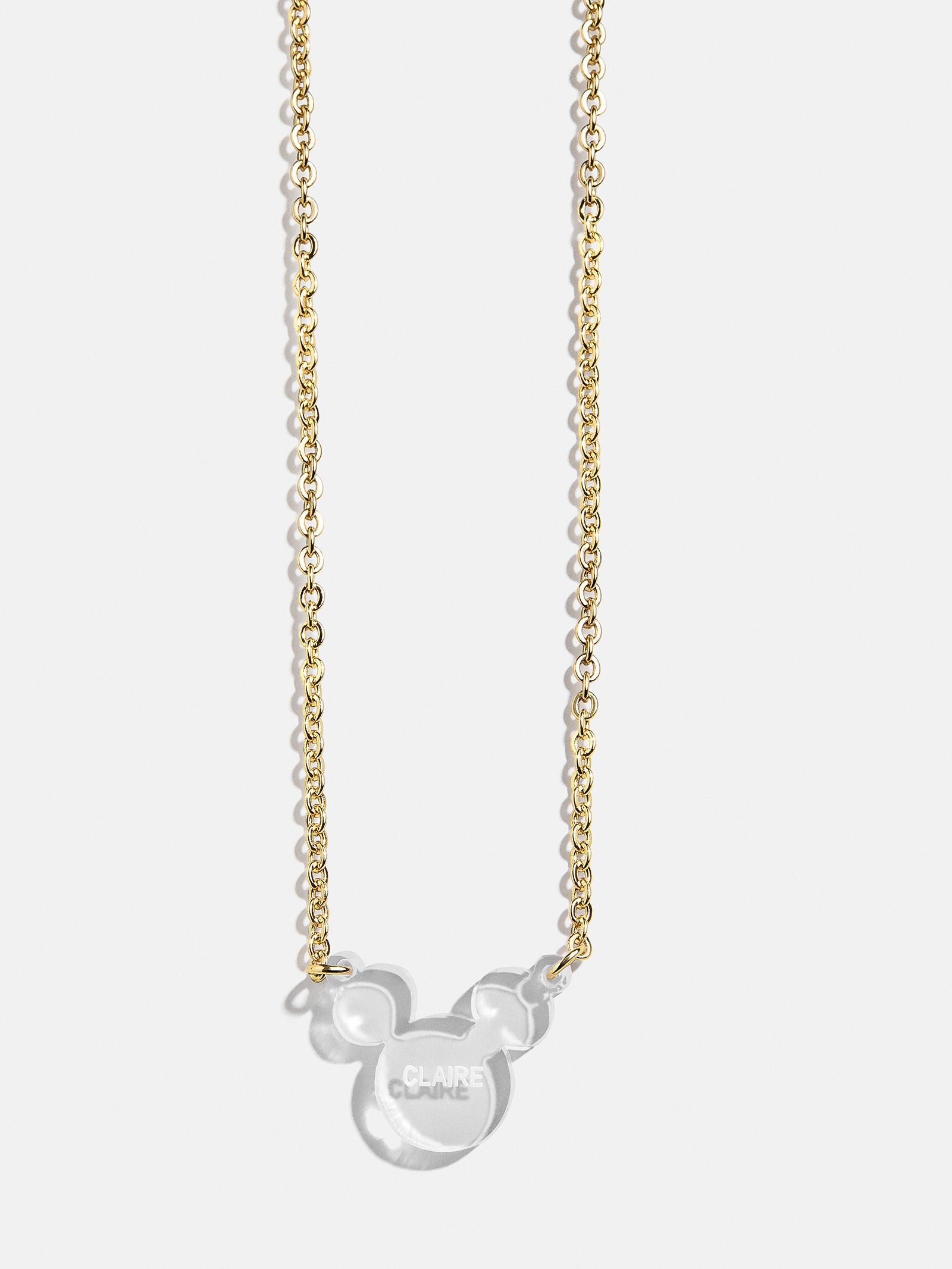 We combined the best of both worlds – Disney and custom. This custom name piece features a modern gold chain attached to an acrylic nameplate in your choice of color and font. Featuring the personalization of your choosing followed by the iconic Mickey Mouse silhouette. It’s the perfect gift for a Disney fan (or for yourself!). Please note. we’re unable to produce necklaces with profanity.