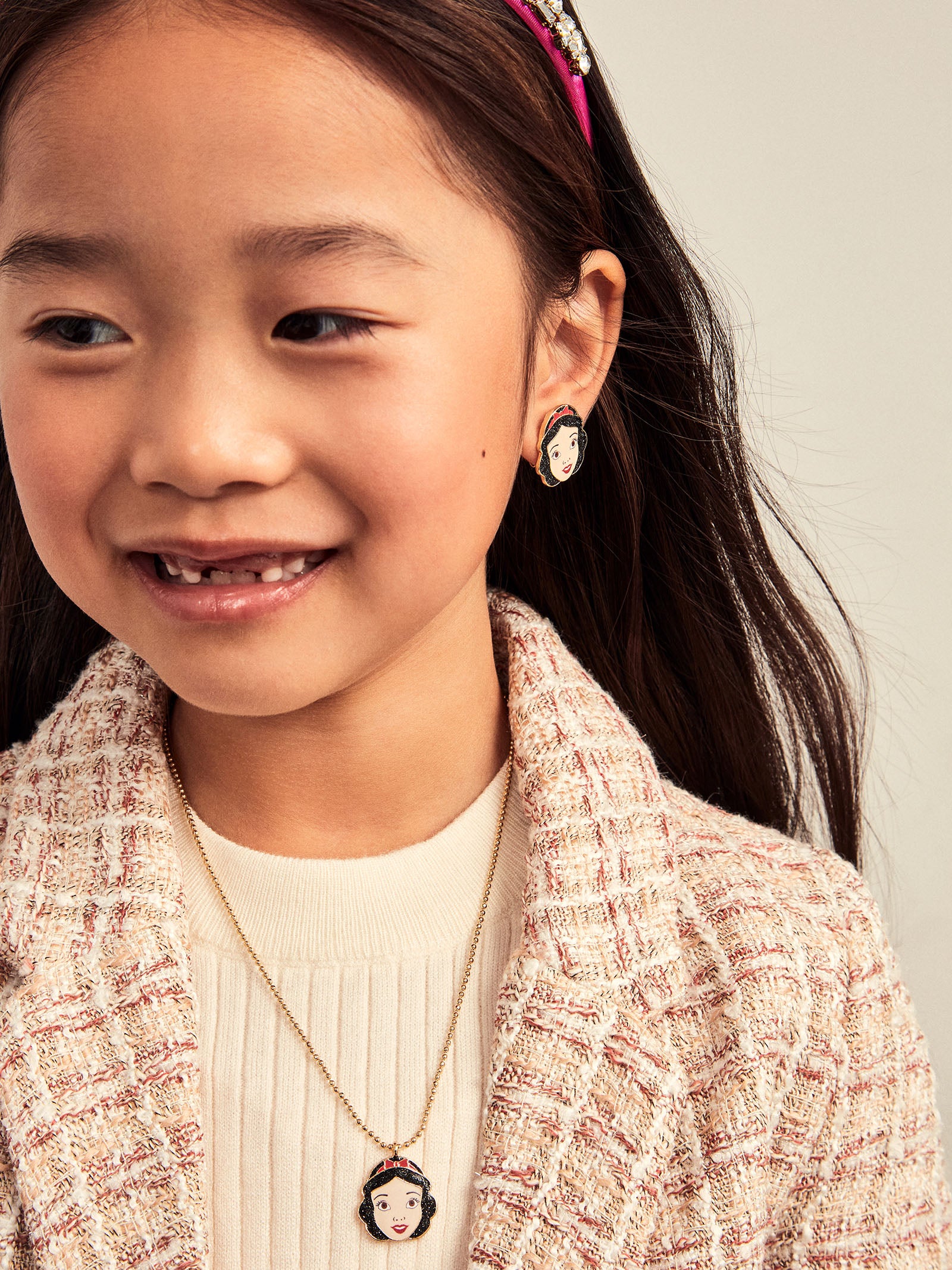 Make your little one’s Disney dreams come true with this beautifully boxed Disney Princess set. Each set contains one pair of clip-on earrings and one necklace. with each piece featuring one of nine Disney Princesses. The Snow White Disney Princess Kids’ Jewelry Set features Snow White from the movie Snow White and the Seven Dwarfs crafted in bright enamel and glittery gold hardware.