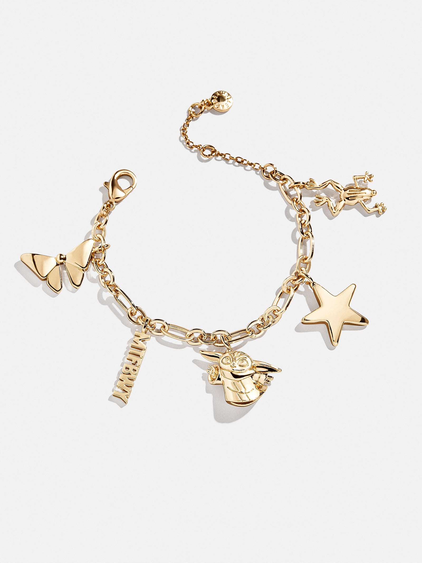 Show off your love for everyone’s favorite foundling with the STAR WARS? GROGU? Charm Bracelet! Designed in classic gold coloring. this bracelet features Grogu himself. a star. a frog. a butterfly. and a MTFBWY charm. Sleek and trendy. this gold bracelet lets you wear your fandom in style.