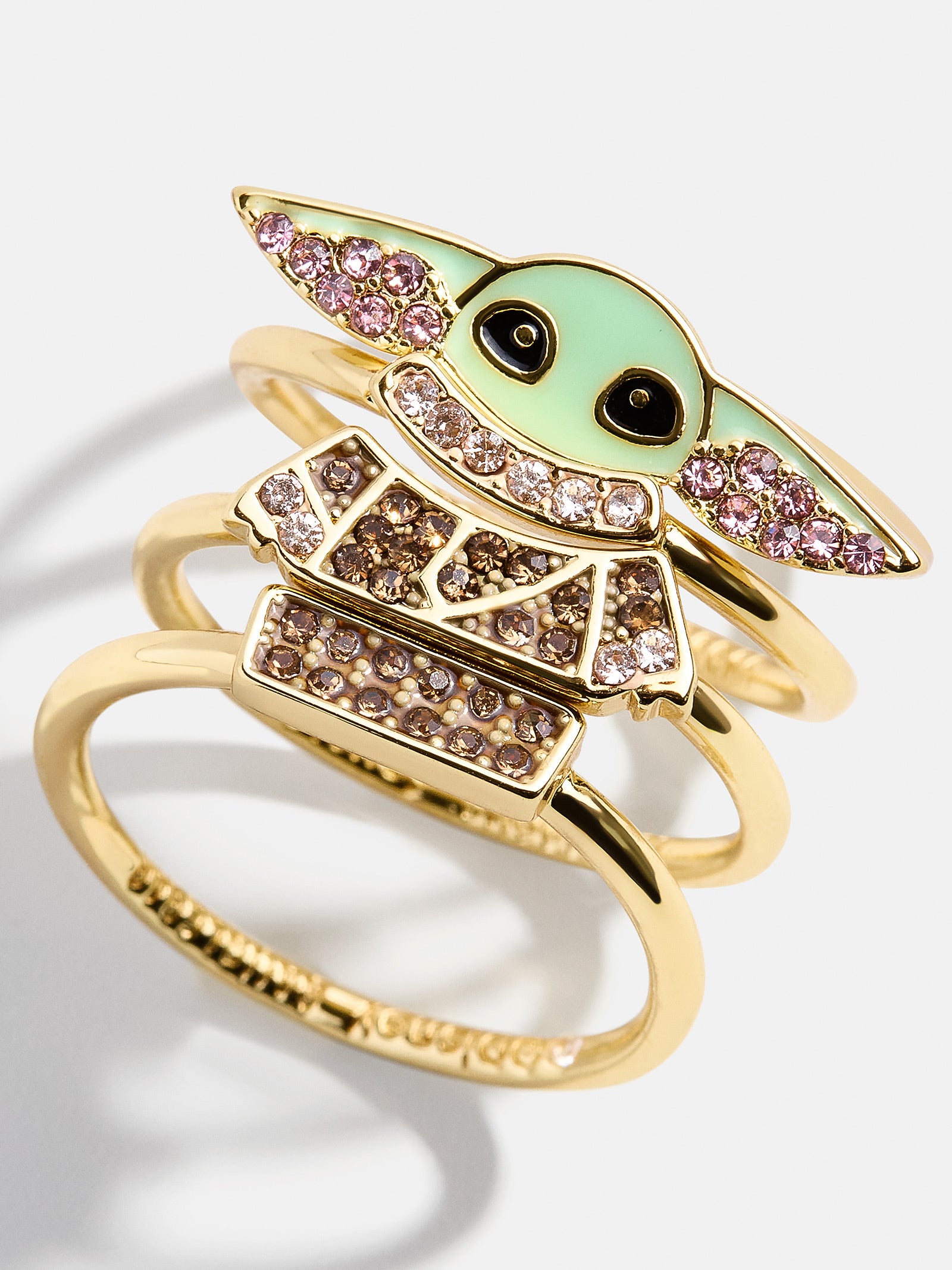 This might just be the coolest ring set in the galaxy. The STAR WARS? GROGU? Ring Set includes four rings that when stacked together. create the character’s full body. Playful. fun. and sparkling with pav?? stones. this ring set is the perfect personality piece for any Star Wars fan.