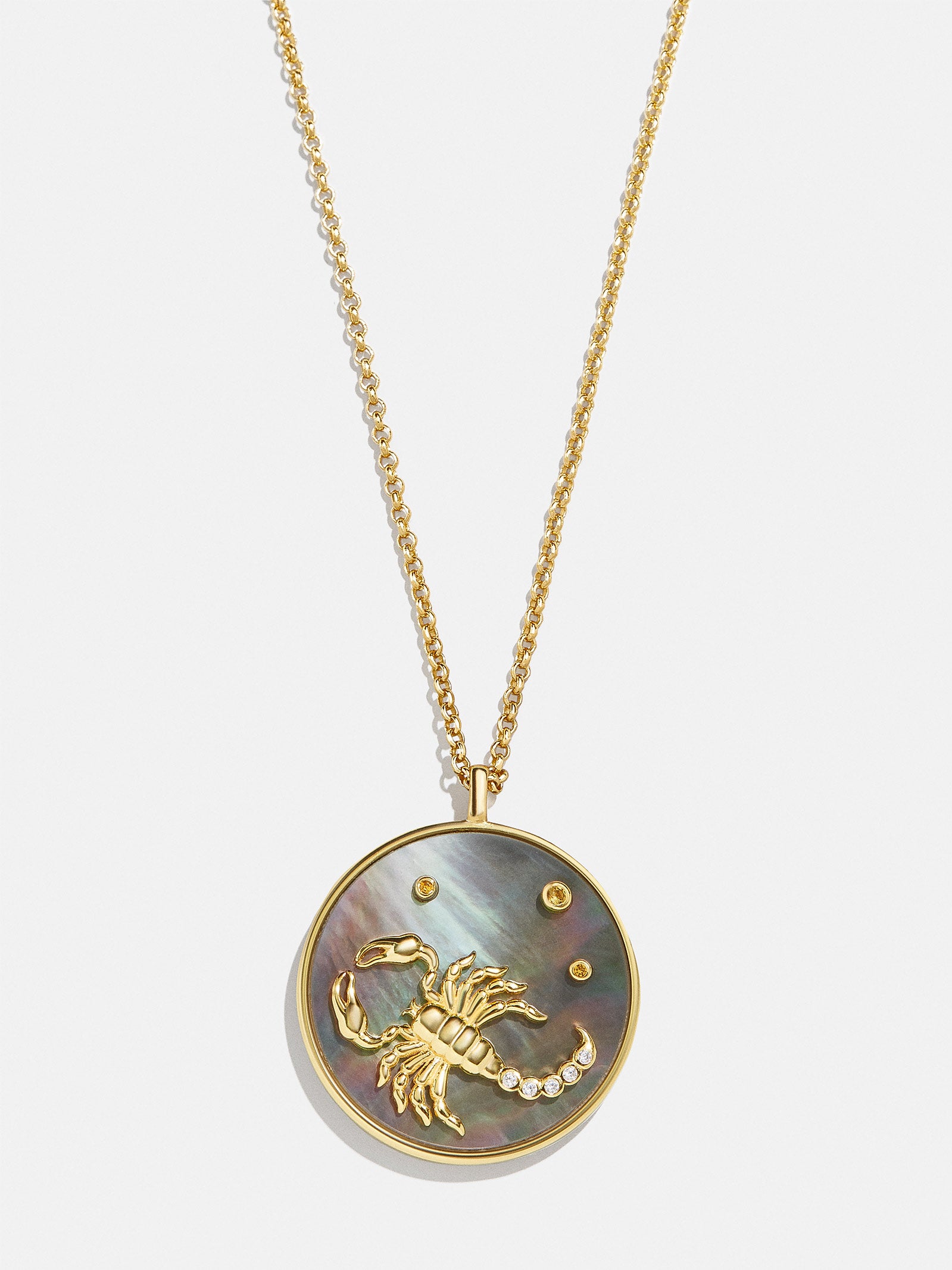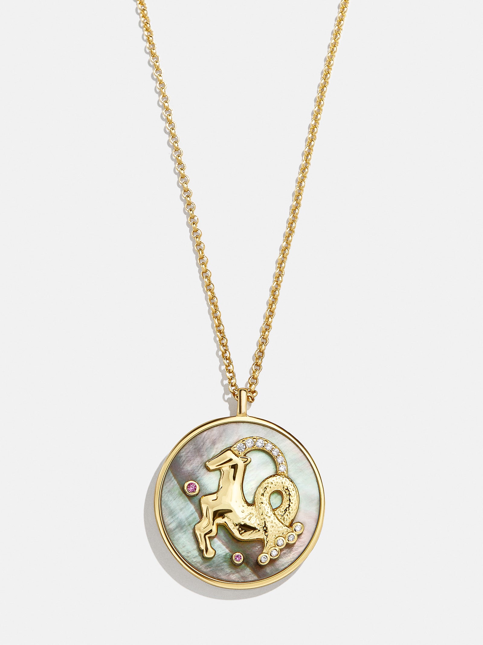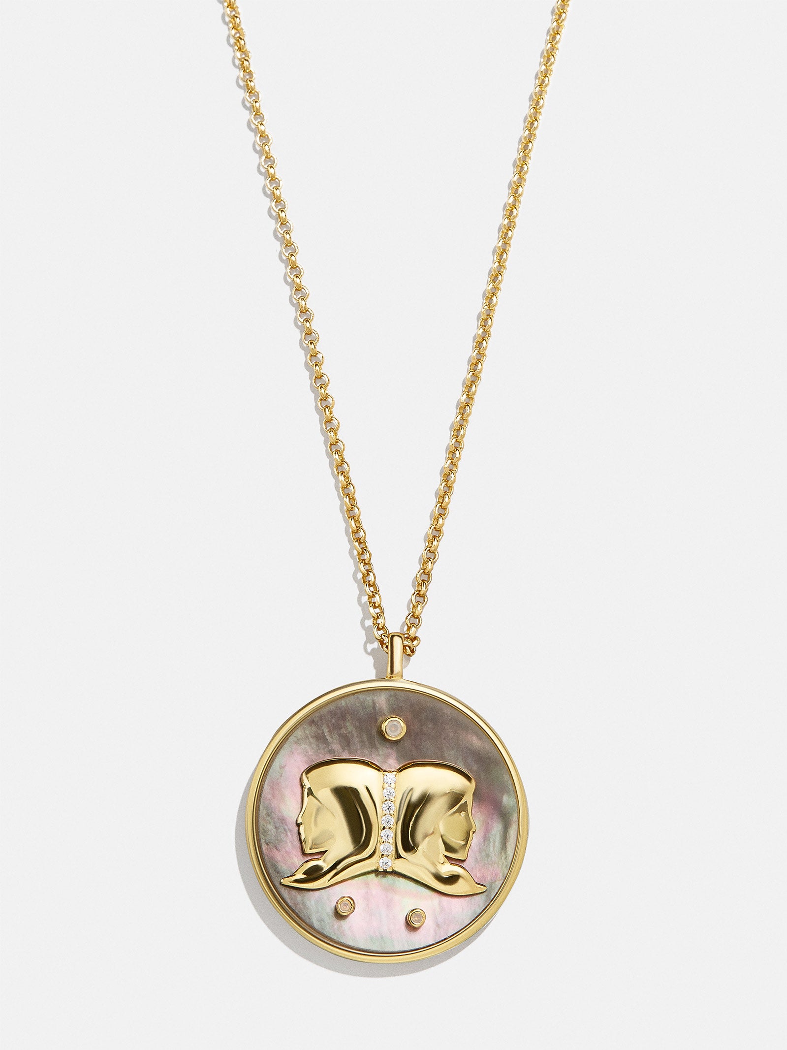 This is your sign. Our collection of reversible zodiac medallion necklaces will be by your side through every solar return. Mercury retrograde. and lunar eclipse. Each pendant is crafted with 18K Gold and luxe Cubic Zirconia stones. One side features gorgeous mother of pearl with gem accents. while the other is gold with a pretty pav?? border. Opt to add your sun. moon. or rising sign (or all three!) to your stack for layers that will guarantee good energy.