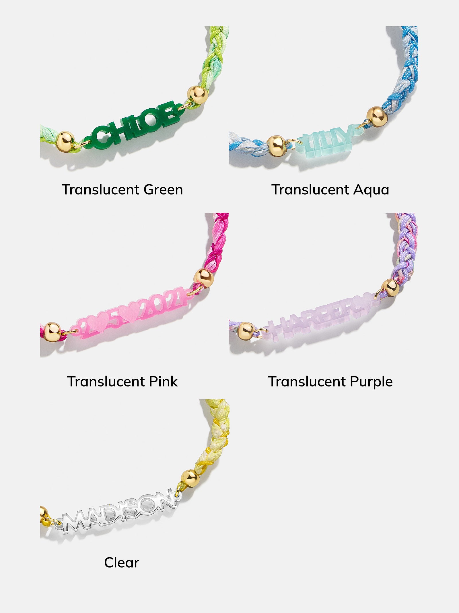 Spice up your child’s style with our Acrylic Kids’ Custom Nameplate Bracelet! Featuring a playful acrylic nameplate and colorful braided wristband. this accessory is perfect for kids who love to stand out.
